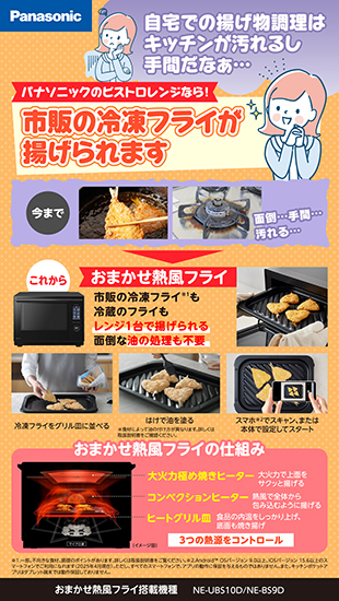 最新のビストロ機能では、冷凍フライを油で揚げなくとも、「おまかせ熱風フライ」でレンジで揚げられるようになりました。手間のかかる油処理をしなくていいので、より便利にラクになりました!
