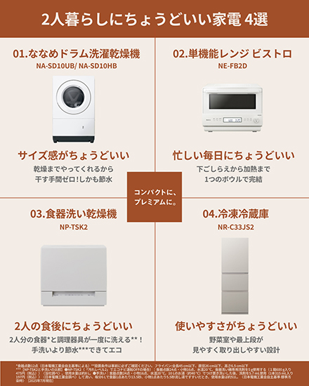 パナソニックには一人暮らしに適したコンパクトサイズ、4人家族に適した大容量サイズの家電があります。お客様の暮らしにフィットする製品が様々!